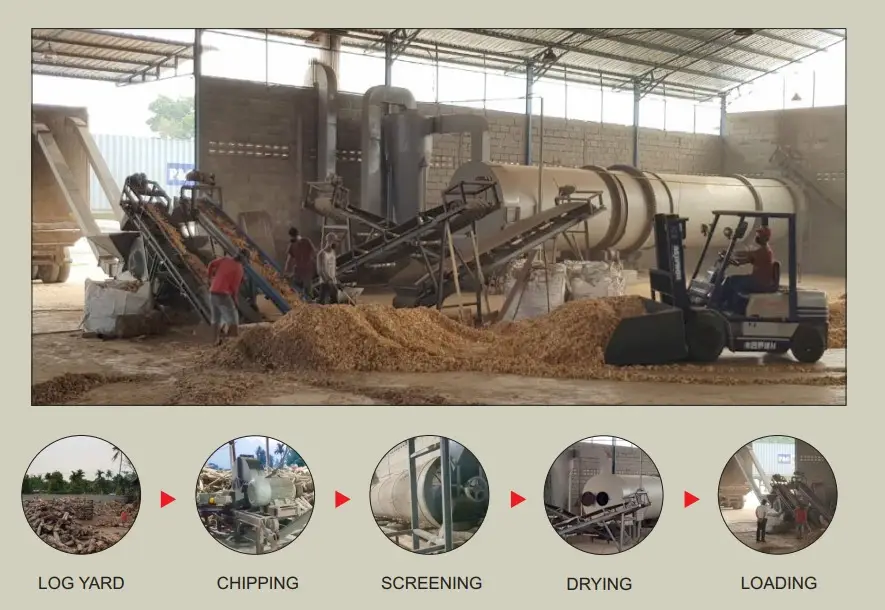 Woodchips are produced from log woods that are cut into pieces sized 10-50mm using a chipper machine. The Woodchips are then cleaned through a screening and drying process using a rotary screen and rotary dryer until the moisture content reaches 20-30%.